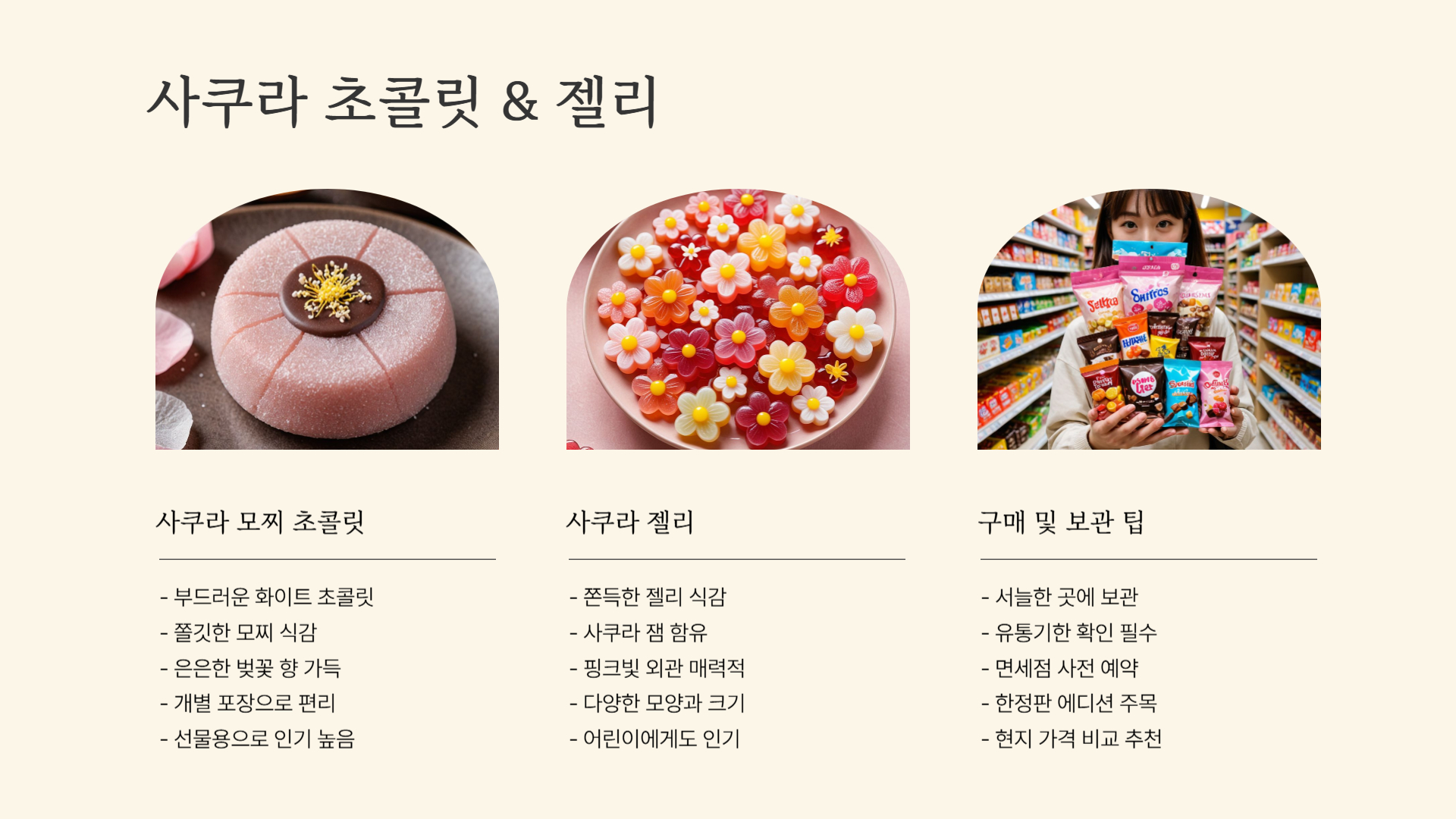 오늘은 벚꽃 여행 필수 쇼핑템인 일본 한정 사쿠라 간식을 소개해드렸어요. 🌸 벚꽃 시즌에 일본을 방문하신다면, 한정판 사쿠라 간식을 꼭 챙겨보세요!