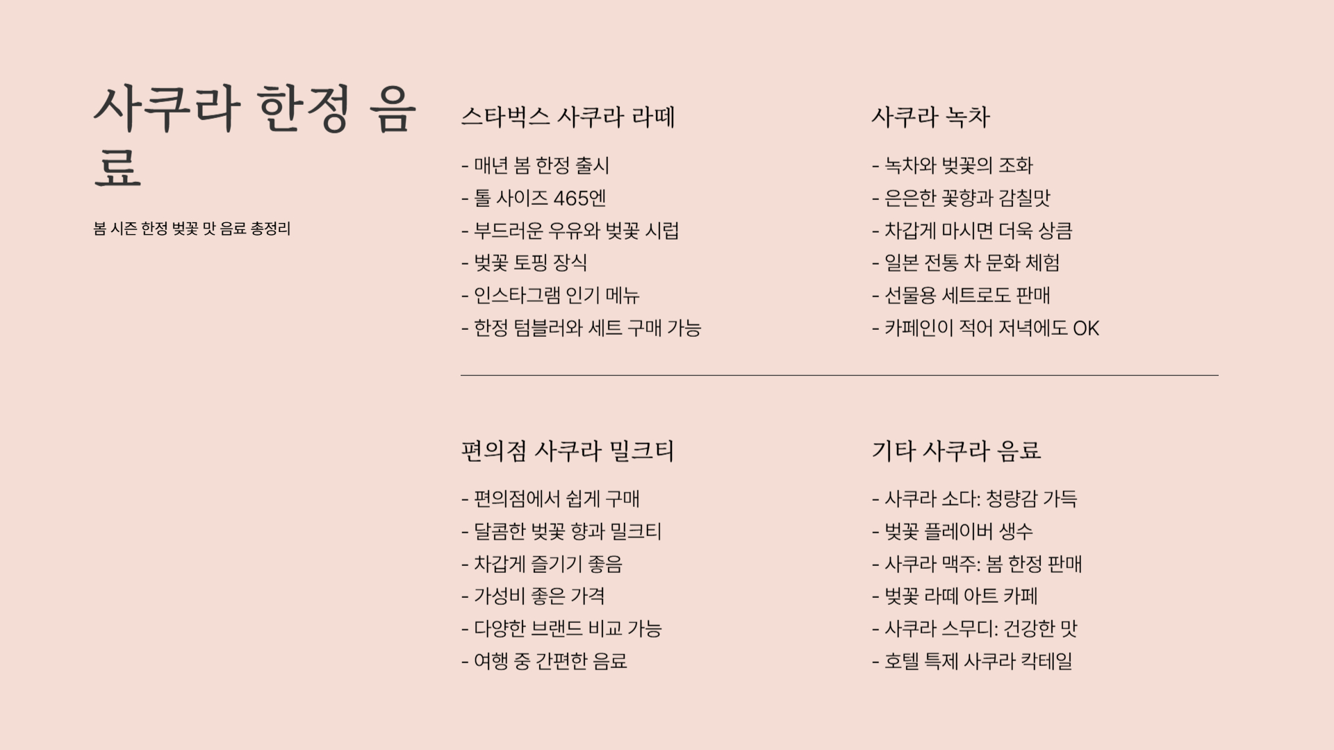 커피, 티, 그리고 편의점에서 쉽게 살 수 있는 사쿠라 음료까지!