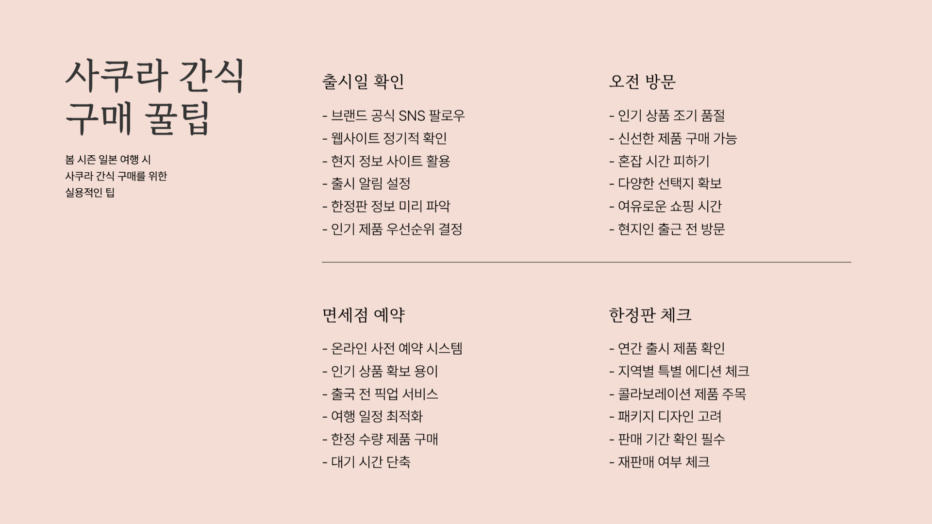 벚꽃 시즌 한정으로 출시되는 사쿠라 간식들은 조기 품절될 가능성이 높아요. 아래 팁을 참고해서 알뜰하게 쇼핑하세요!